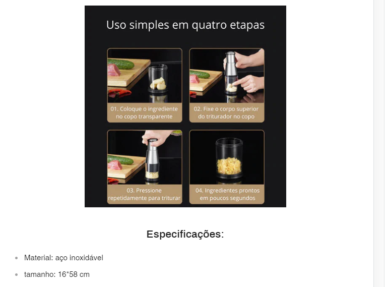 O Novo Triturador é uma peça que faltava para sua cozinha, muito simples de usar e em poucos segundos o alho, a cebola, entre outros vegetais estarão picadinhos sem muito esforço, assim seu legume se desfaz melhor na hora do cozimento da carne, deixando-a muito mais saborosa.